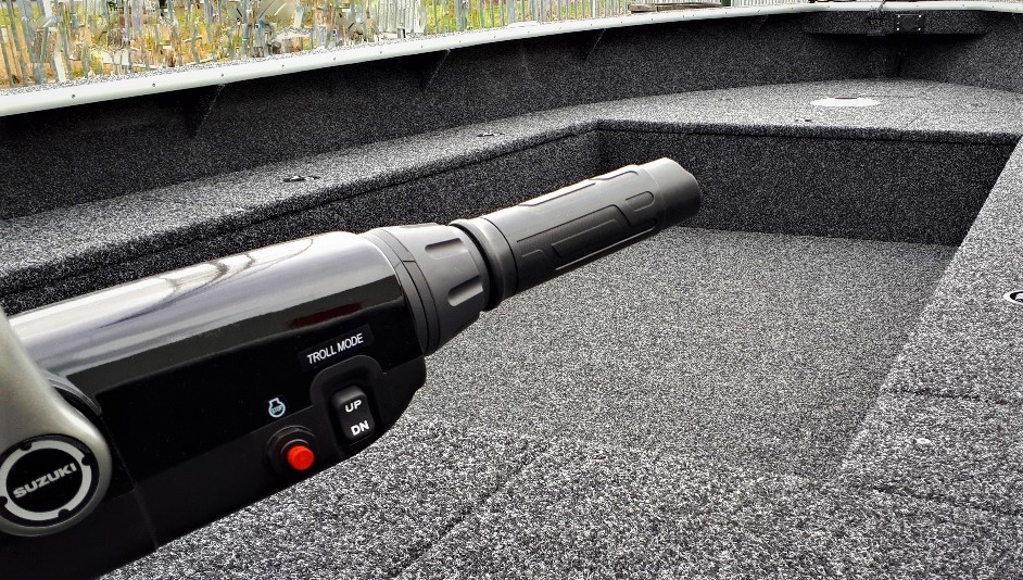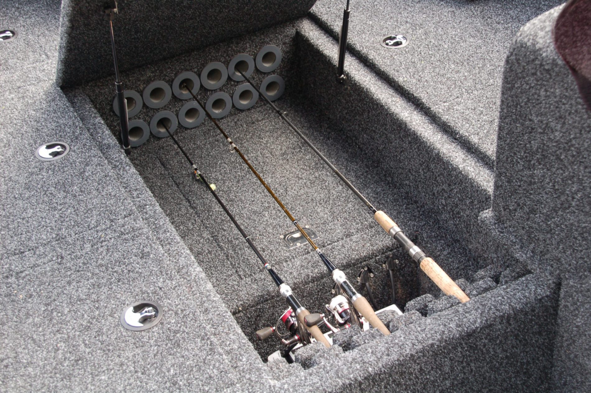 En option, une boîte de pêche peut être transportée dans et sous le pont avant de ce bateau, ce qui donne au pont avant beaucoup plus d’espace et de rangement et facilite le lancer.